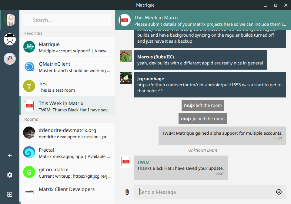 As you may know, Matrique, led by Black Hat, and Quaternion, led by kitsune, are both projects build using libQMatrixClient, a Qt5 library from kitsune designed for writing Matrix clients. While kitsune has been working on the library for some time, Black Hat has also now started making contributions: