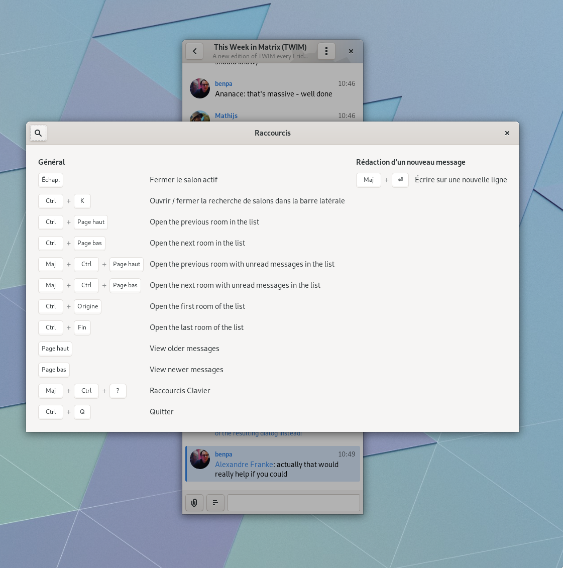 Ana, first time contributor, added a bunch of cool keyboard shortcuts to ease navigation in Fractal. One can now e.g. go down to the next room with unread messages with ctrl+shift+page down.