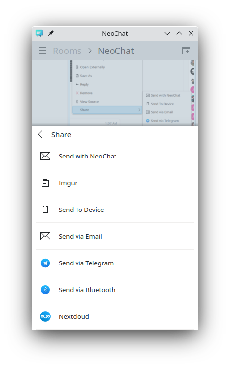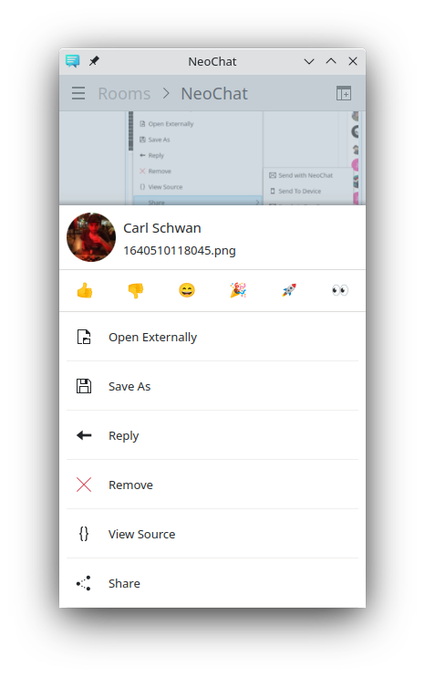 NeoChat 22.02 is out with the possibility of sharing files directly from NeoChat to other apps and services (Nextcloud, Imgur, email, ...). We also added support for minimizing the application to the system tray on startup and you can now label accounts to better organize them if you are using the multi-account feature. Aside from that, we spend some time fixing many small bugs and paper cuts reducing the total amount of open bug reports by 20%.