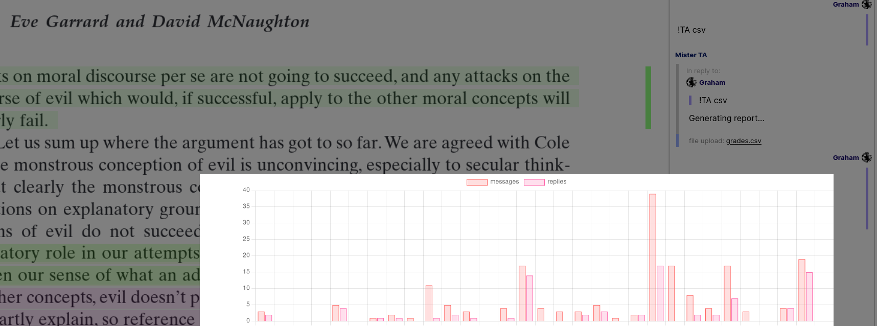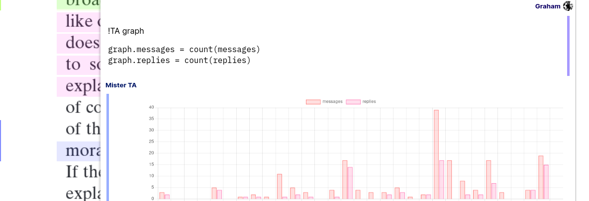 Number 4 works nicely with my teaching-assistant-bot (built with matrix-bot-sdk, mathjs, and chartjs), which helps me visualize information about student activity.