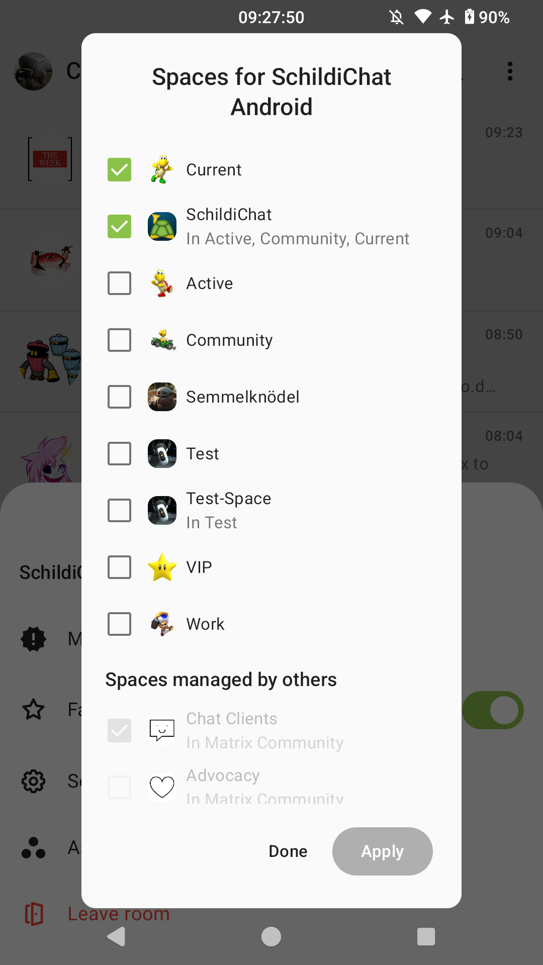 On the feature side, one of the main points that made me switch back to the old SchildiChat app was the ability to manage rooms in spaces. Accordingly, I added a long-press action to the room list that allows you to select a room's parent spaces to add to or remove from. At the time of writing this change is still only included in beta builds behind a feature flag, but will probably arrive in a release build in the next few days.