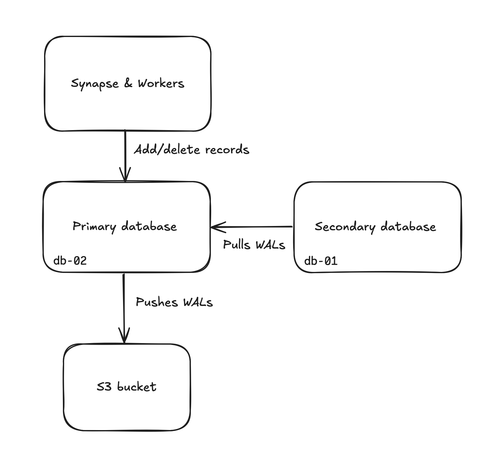 A schema showing Synapse connected to a primary database. It also shows a secondary database pulling WALs from the primary. Finally the primary database also pushes WALs to a S3 bucket.